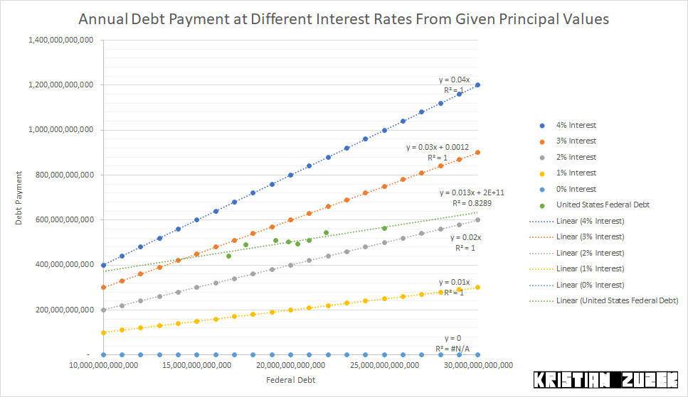 At a current debt level of $27,748,085,000,000 having a 2% interest rate, annual debt payments would be $554,961,700,000 according to calculations made with public data. Previous White House Budgets show a lower annual debt payment.