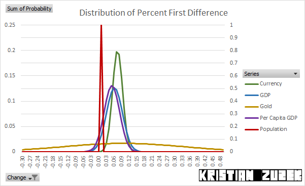 Historically, there are distinct differences between the variations of a group of significant series. Their distribution of yearly changes vary extremely differently each having a different mean. Population is the only series on the right vertical scale.