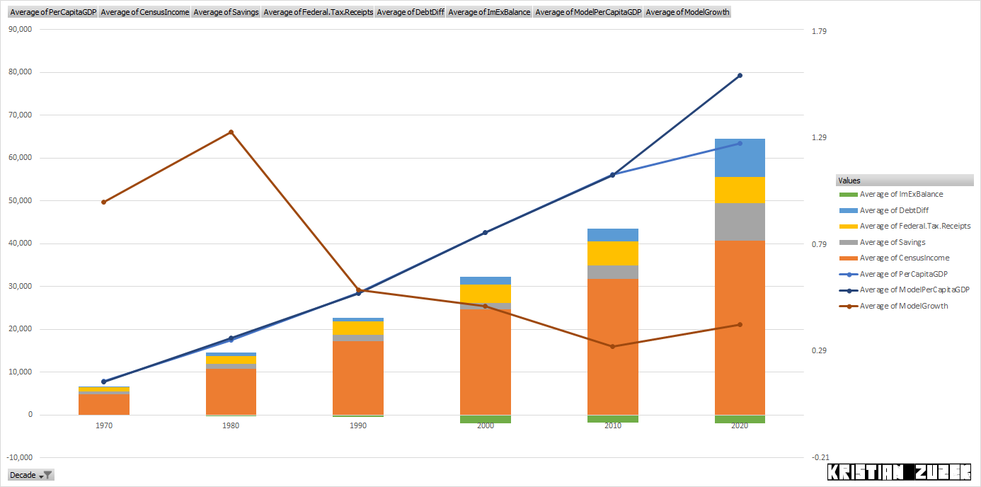 | Decade | Rows | PerCapitaGDP | CensusIncome | Savings | Federal.Tax.Receipts | DebtDiff | ImExBalance | ModelPerCapitaGDP | ModelGrowth |