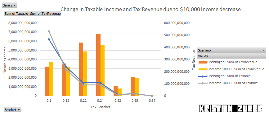 Progressive Tax Policy. When an event such as an Apparently Benevolent Global Pandemic decreases Personal Income by $10,000 then 46,459,531 people would move from their expected Tax Bracket down to the adjacent lower Tax Bracket. The result would cause a decrease in income tax revenues from $1,700,000,000,016 to $1,517,470,184,255. Federal Governments try to "bailout" State and Municipal governments, and provide income support for people. For themselves, they increase bond sales and occasionally debase their currency.