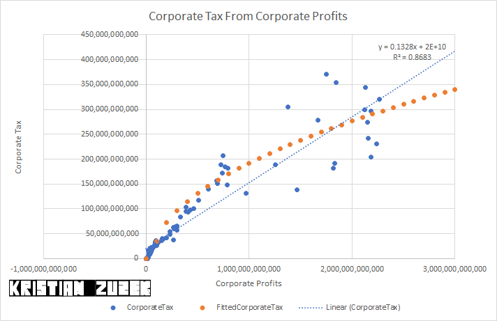 How the revenues of governments and corporations are effected by regular economic depressions instead of Contract and Financial fraud is difficult to seperate. Under these circumstances (2021-03-20) a corporate profit of $2,701,958,636,993 would give $325,000,000,000 of corporate taxes. However, due to the nature of reduced economic activity and accounting rules, a $1 decrease in corporate profits does not create $0.12 of decreased corporate tax revenue as one could expect. According to a White House Budget corporate taxes are the most gifted by tax law and are currently decreasing about $0.45 per $1 of decreased corporate profits.
