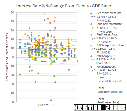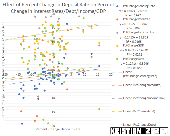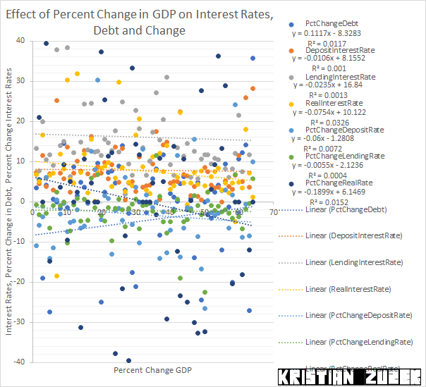 During the full sample period, there is no statistical significance between Percent Change in GDP and all other economic series. Contrast this finding with the Relations to Deposit Rate on the World Tax and Income page which has fewer country's in the sample of data and more statistical significance.
