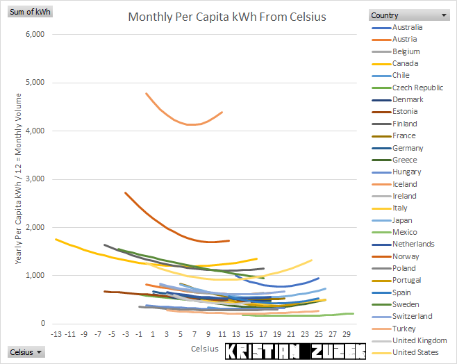 Monthly Consumption patterns in electricity consumption can appear purely temperature related. However, yearly social patterns such as school closure and national holidays can cause the temperatures during lower behavioral baseload consumption appear to be a minimum of consumption. In reality, the utility and infrastructure of electricity consumption is primarily survial and production only then followed by the frivolity of leisure.
