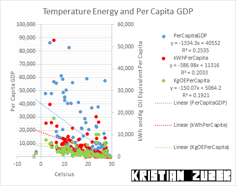 The relation of Electrical Transmission Loss to temperature can be described as a combination of the physical Temperature coefficient of resistivity and the "stochastic scattering" above and below the least squares regression line which would represent the ability of sovereign nations to manage their energy infrastructure.